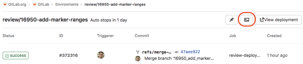 stages: - build - test - deploy ... deploy_review: stage: deploy environment: name: review/$CI_COMMIT_REF_SLUG url: https://$CI_ENVIRONMENT_SLUG.example.com on_stop: stop_review stop_review: stage: deploy environment: name: review/$CI_COMMIT_REF_SLUG action: stop when: manual -
