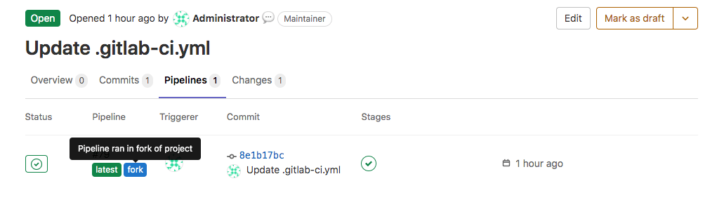 - The fork project must be visible to the user running the pipeline. Otherwise, the Pipelines tab does not display in the merge request.