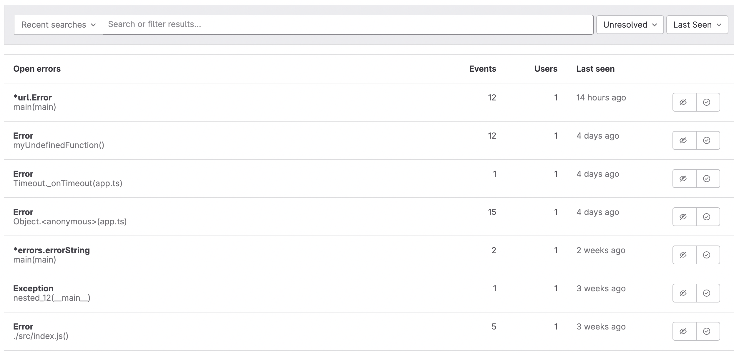 You can now visit Monitor > Error Tracking in your project's sidebar to view a list of Sentry errors.