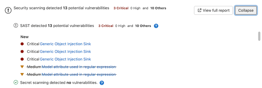 Statistics and details on vulnerabilities are included in the merge request. Providing actionable information before changes are merged enables you to be proactive.